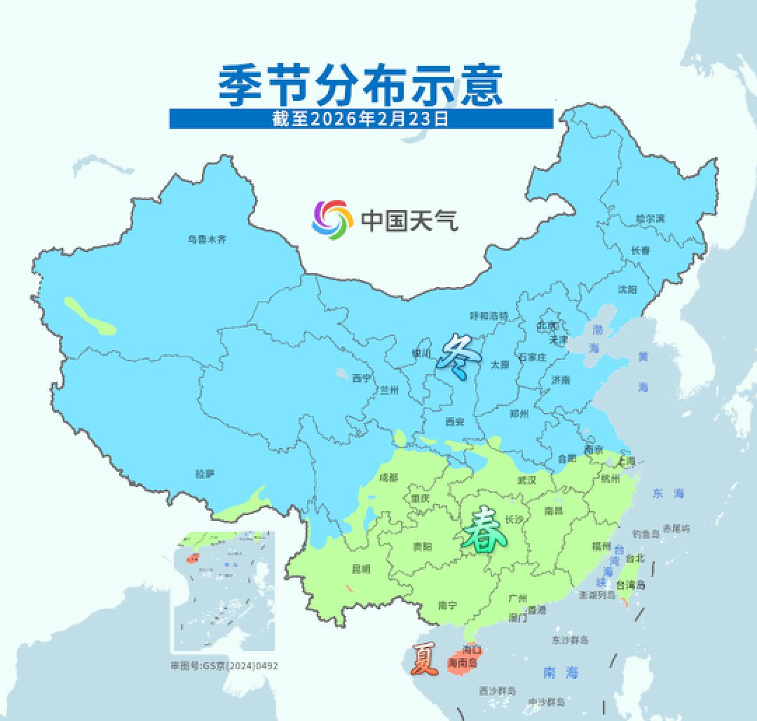 从全国范围看,截至今天(2月24日),春季前沿至少已经到了甘肃南部—陕西南部—河南南部,换季进程快于常年。四川盆地绝大部分城市都已入春。